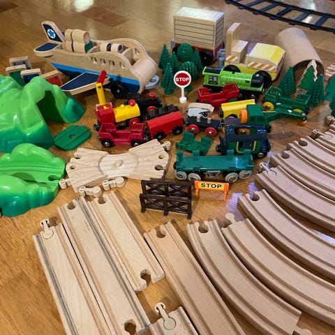 Träjärnvägstågset med raka o böjda träspår i olika längder, tåg, fordon och tillbehör inklusive kran för att lyfta av containers från vagnarna.