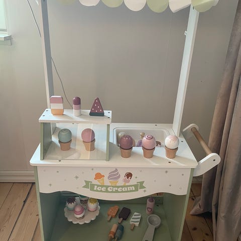 Glasstånd Tooky Toy i trä från Jollyroom. Ena pinnen på en glass lossnat, men går enkelt att limma dit igen. Menyn med ett veck på. Övriga delar helt i nyskick!