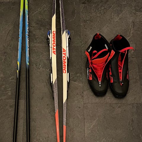 Säljs i set som inkluderar vallningsfria längdskidor, två par stavar i olika längd, samt ett par pjäxor. Passar för längdskidåkning. Säljs pga förrådsrensning