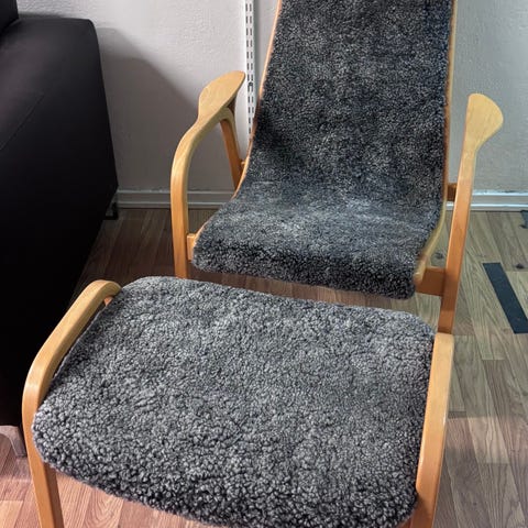 2 st Lamino fåtöljer med pallar, oljad ek, grått fårskinn