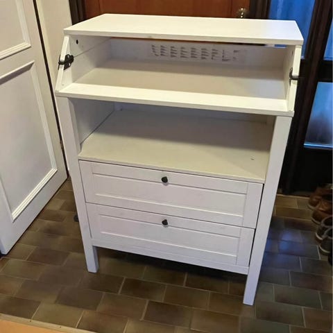 Skåp med skötbord till som enkelt kan skruvas av eller på vid behov. Fungerar perfekt som skötbord tack vare förvaring ovanför där man kan ha blöjor med mera.