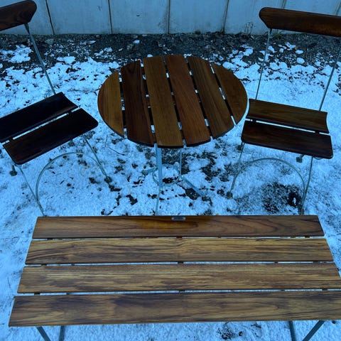 Grythyttan bryggerisoffa. Vitlackerad ek med varmförzinkat stativ. Bredd 120 cm.
