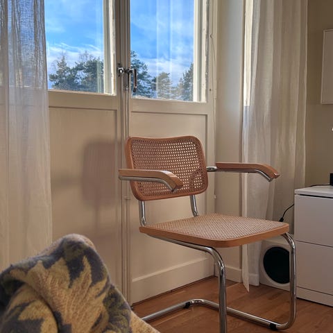 Superfin Bauhaus stol med armstöd. Litet slitage fram på sätet som jag försökt få en bra bild på därav priset. Denna lilla slitning är inget som stör funktionen.