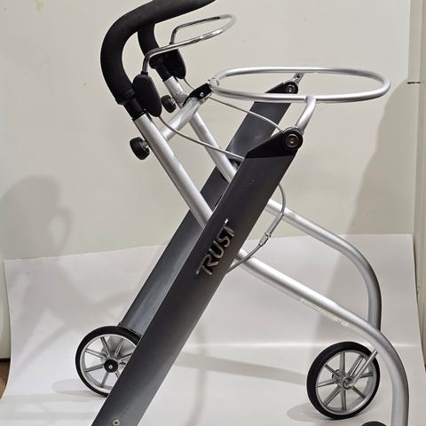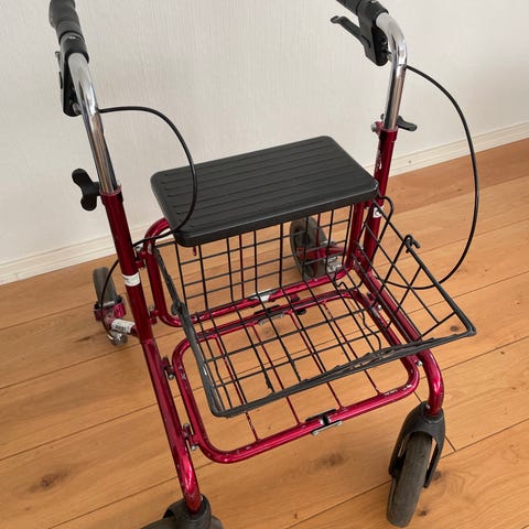 Gånghjälpmedel med tre hjul och inbyggd sits. Konstruktion i metall med trädetaljer och svart sittplatta. Utrustad med handtag med mjukt grepp. Avsedd för stöd vid gång och vila.