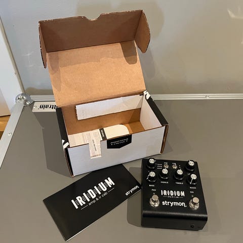 Strymon Mobius gitarr-effektpedal i blå färg. Pedalen har flera reglage för värde, hastighet, djup och nivå samt tre fotomkopplare. Produkten levereras med originalförpackning och manual.