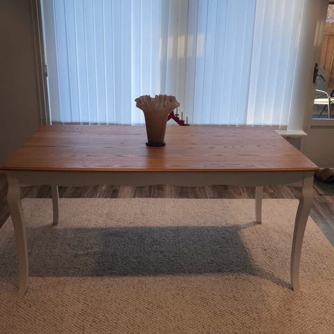 Säljer vårt rejäla matbord! Underrede i borstat stål. (Köpt på Bolia) Bordskivan är gjord av plankor som vi målat vita. Fläckar och märken finns men blir som nytt med ett lager färg. Man kan även byta till annan bordsskiva om så önskas.