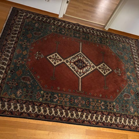 Handknuten ullmatta från "Matt tema". Bra begagnat skick, kan behöva lite matt tvätt.