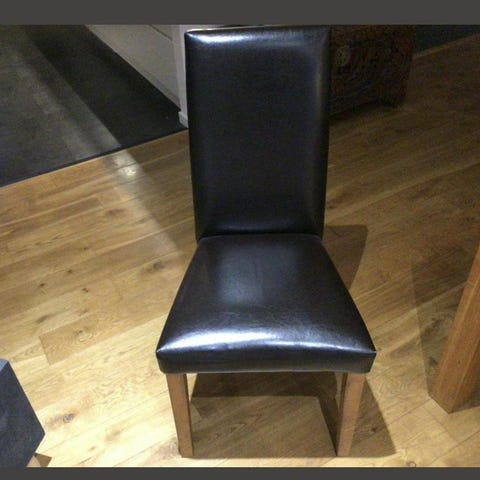 Svart stol med sits och ryggstöd i konstläder samt ben i metall. Stolen är lämplig för användning i matsal eller kontorsmiljö. 500 kr för alla sex.