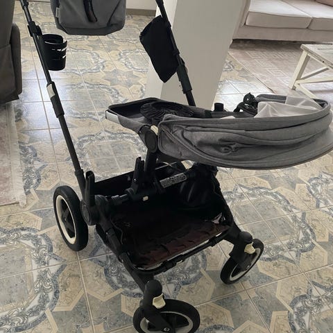 Bugaboo barnvagn i brun färg. Inkluderar sittdel och liggdel. Barnvagnen har en justerbar sufflett och säkerhetsbåge fram. Ram i svart med svarta hjul och handtag. Passar för barn och är avsedd för daglig användning.