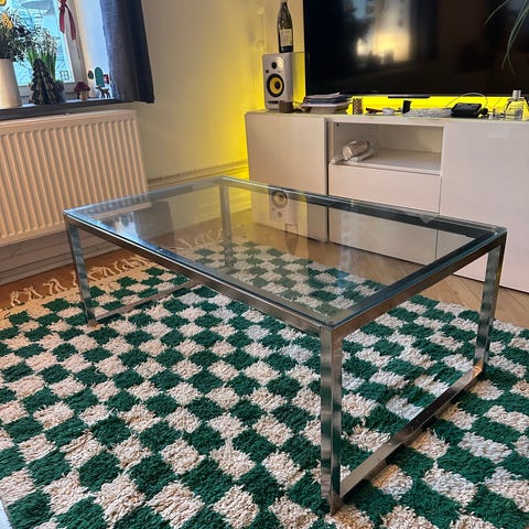 Jättefint glasbord med snyggt jakarandaunderrede till soffbord.