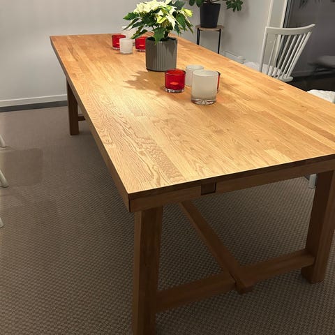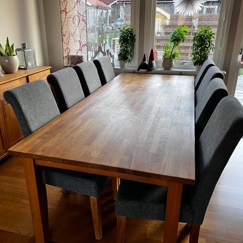 Fint skick på bordet. Bordet är behandlat en gång mer än iläggsskivan vilket gör att där är en viss färgnyans, vilket går att justera genom att behandla bord och iläggsskiva igen.
