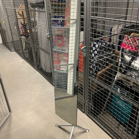 Snygg och stilren golvspegel från Mio, modell Helios. Spegeln har en brun ram i trä och passar lika bra att placera på golvet som att hänga på väggen. På baksidan finns stålvajer för enkel upphängning.
