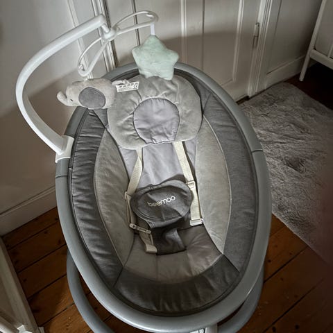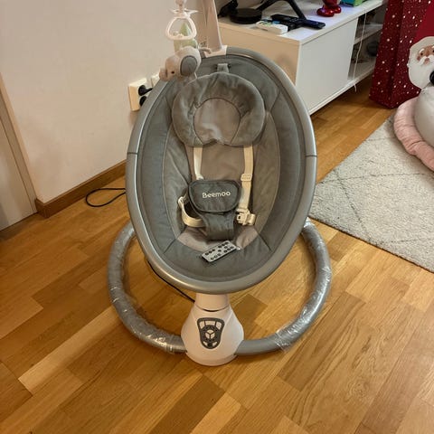 En välfungerande babysitter som kan vagga barnet i olika hastigheter. Sitsen går att vrida och vinkla i olika ställningar. Kan spela ljud och melodier.