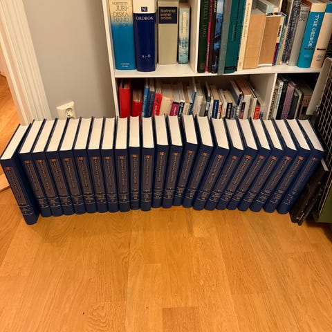 Samling av uppslagsverk i bokform. Böckerna har hårda pärmar i rött och svart med guldfärgade detaljer. Passar för referens och informationssökning. 25 st