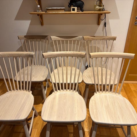 4 st stolar i exklusiv utgåva i ask, en stol har en spricka (se bild). Det finns fårskinnssitsar till från Skandilock. För jämförelse pris ca 4100kr styck i vitoljad björk.