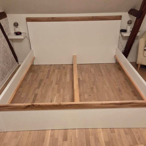 Sängram med en stor låda, finns några skav och lådan är missfärgad på några ställen, se bild. Ramen ä 48 cm hög och passar till 90x200cm resårmadrass. Sängramen är köpt på Sova.