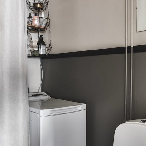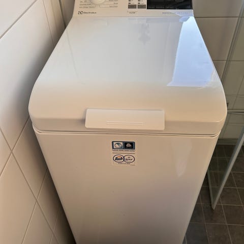 Whirlpool AWE 2316 45cm toppmatad tvättmaskin. Vit färg med lucka på ovansidan för påfyllning av tvätt. Maskinen är avsedd för tvätt av kläder och textilier.