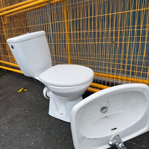 Set bestående av en toalettstol och ett handfat (retro) i vitt. Toalettstolen (ifö cera) har en spolkknapp på toppen.