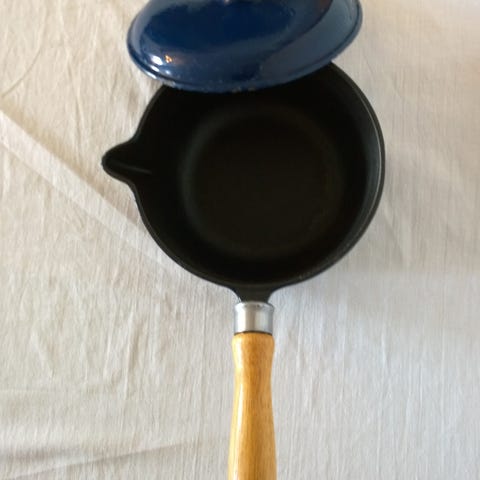 Husqvarna emaljerad kastrull och ugnsform i blå färg. Setet inkluderar en kastrull med handtag och en rektangulär ugnsform med lock. Tillverkade i emaljerat gjutjärnsmaterial, lämpliga för matlagning och ugnsbruk. Mindre skav på kanten på ugnsformen.
