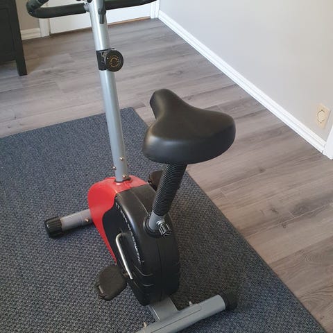 motionscykel med digital display och flera träningsnivåer. Utrustad med justerbart säte och handtag för anpassad ergonomi. Passar för hemmaträning och konditionsövningar.