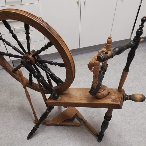 Blå trä spinnrock med stor hjul och detaljer i svart. Traditionell design med handvev och stabilt stativ. Används för att spinna garn från fibrer.