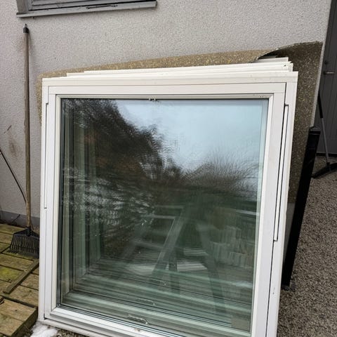 Vitt 3 glasfönster med ett vädringsfönster vid sidan av ett stort fönster. B 157 cm. H 138 cm. D 11 cm.