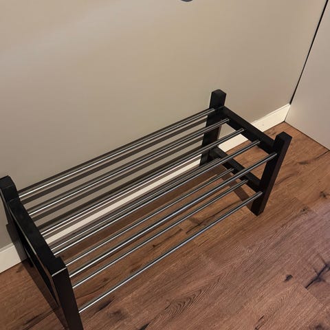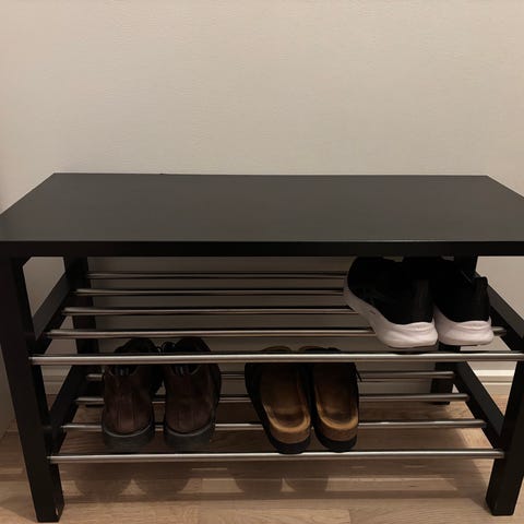 Jag säljer min IKEA skohylla med sittbänk. Sittytan är i svart tjock plast och resten av skohyllan är i svart metall. Skohyllan är väldigt stadig och har bara några få, små repor på bänken.