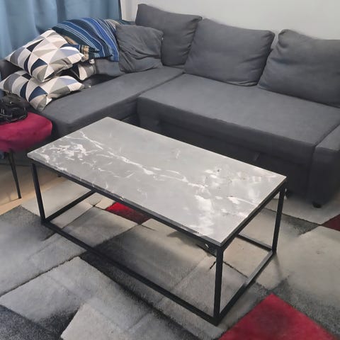 Amanda soffbord från Mio. Matt vit marmor med svarta ben. Själva marmor stenen är i bra skick men benen är skrapat längst vid golvet (se bild 3).
