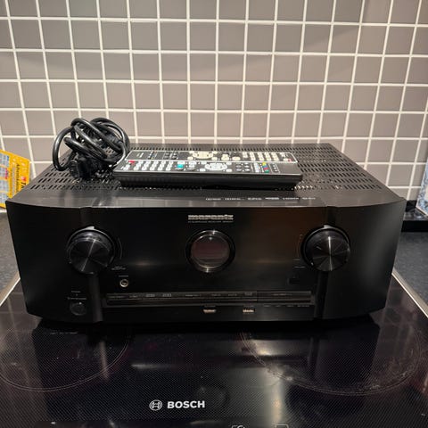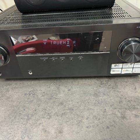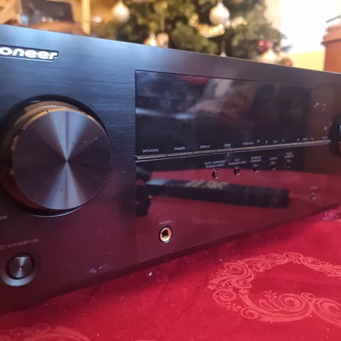 Pioneer AV Receiver med flera anslutningar inklusive HDMI, optisk och koaxial digitalingång, samt analoga ljud- och videoingångar. Det följer med en liten "puck" som kalibrerar ljudet på förstärkaren. Utrustad med flera högtalarutgångar för surroundljud, fjärrkontroll och strömkabel inkluderade.