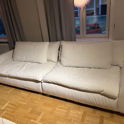 Grovt beige tyg , avtagbar klädsel på 2 två sittkuddar,fyra ryggkuddar & 2 övriga kuddar