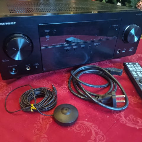 Pioneer AV-mottagare med flera ljud- och videoingångar, inklusive koaxial och optisk digital ingång, samt högtalarutgångar. Enheten har en svart finish och levereras med fjärrkontroll. Passar för hemmabiosystem och ljudanläggningar.