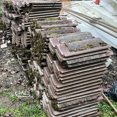 Ett pall oanvänd svart takpannor. Pris: 6 kronor/st