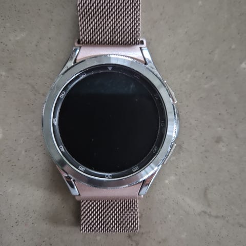 Samsung smartklocka för unisex med rund urtavla och ljusrosa armband. Klockan har digital display och är designad för dagligt bruk.