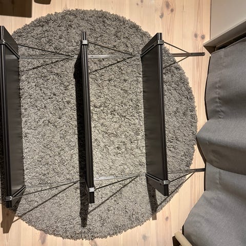 Metallhylla i svart färg med krokar för upphängning. Kan användas för förvaring och organisering i olika rum.