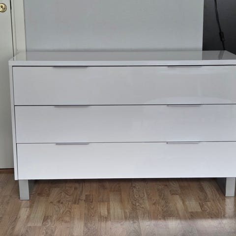Fyra lådor och en dörr med hyllor inuti. Möbeln är vit och ekfärgad.