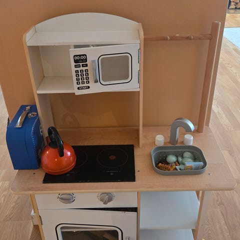 IKEA barnkök med spis, ugn, vask och förvaringsutrymmen. Designat för barn och passar som leksakskök.