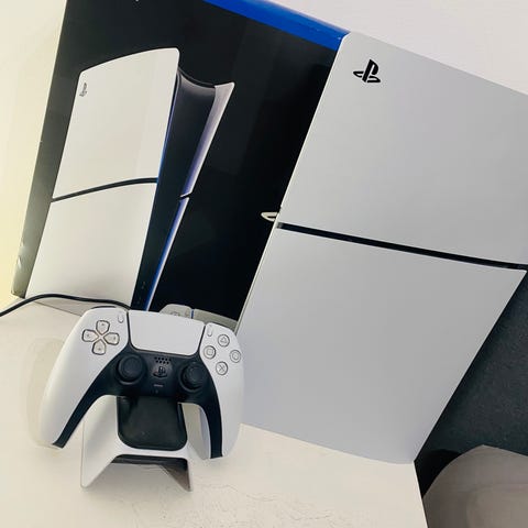 Sony PlayStation 5 spelkonsol med en modern design i vitt och svart. Konsolen erbjuder avancerad grafik och snabb prestanda för spelupplevelser.