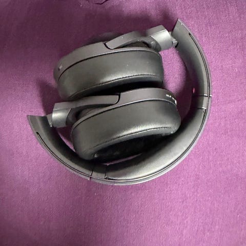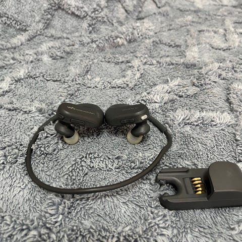 Sony JR410 trådlösa hörlurar i röd färg. Modellen har stereoljud med basfunktion och är designad för trådlös användning.