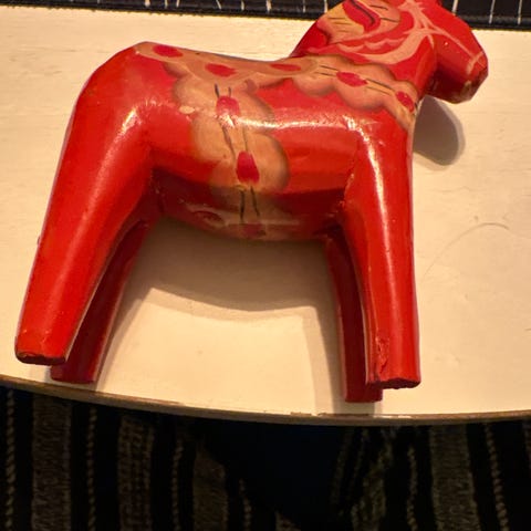 Handgjord dalahäst från Grannas A. Olsson Hemslöjd AB i Nusnäs.