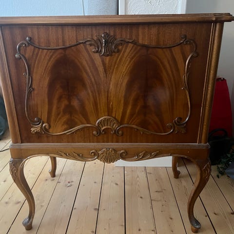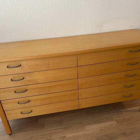 Träbyrå med flera lådor, tillverkad i trä. Byrån har ett antal små och stora lådor med metallhandtag. Passar för förvaring i hemmet.