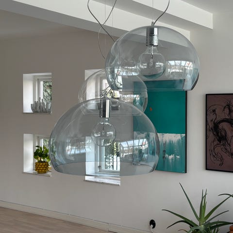 Säljer två stycken pendel Egg 25 från Bsweden designade av Gunnel Svensson. Frostat handblåst opalglas och svart sladd/takkopp. Höjd 25cm och bredd 18cm. Priset gäller för båda