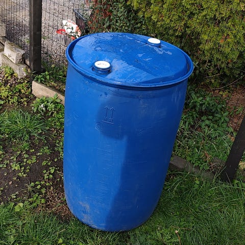 Vit plasttunna med en kapacitet på 200 liter. Tunnan är tillverkad i plast och passar för förvaring av vätskor eller andra material.