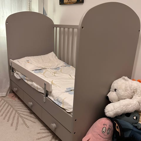 Vitmålad Ikea Kura säng. Perfekt första säng för barn då man kan ha madrassen längst ned men även göra om till våningssäng och högre säng. Sängen är i fint skick, några små skav och en trädel har spruckit till loftsängen. Se bilder!