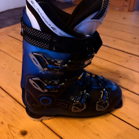 Salomon skidpjäxor i svart och blåfärg, storlek 24,5. Pjäxorna har flera spännen för justerbar passform och är avsedda för slalomåkning.