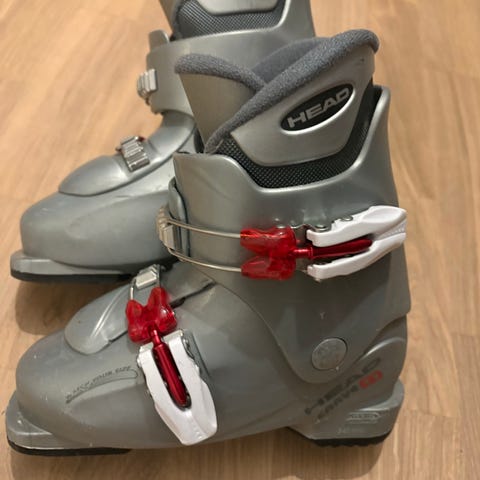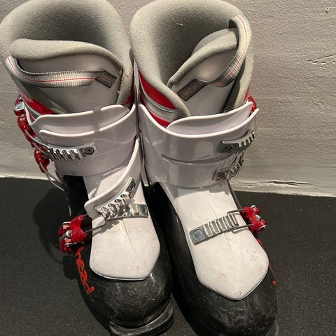 Lila/vita slalompjäxor för barn ca storlek 33-34. Yttermått 255mm. Innermått 205 mm.