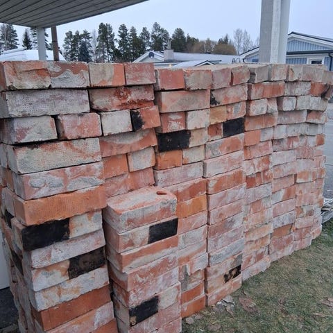 Fyra pallar med tegel, totalt ca 1 050 stenar. Säljs för 10 kr per styck, eller 8 000 kr vid köp av allt tegel.