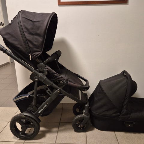 Britax barnvagn utrustad med sittdel och fotmuff. Barnvagnen har fyra hjul och en justerbar sufflett. Säkerhetsbälte finns för att hålla barnet säkert under användning. Fotmuffen är avtagbar och ger extra skydd mot kyla. Det ingår även vindskydd som är anpassad till modellen.