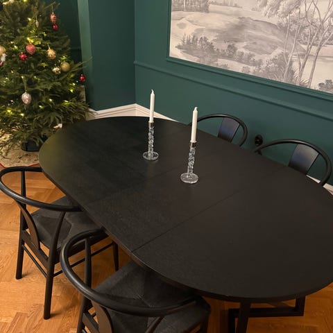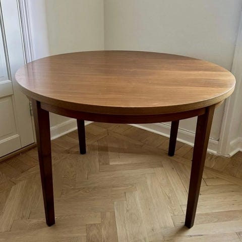 Runt matbord i valnöt, ca 4 år gammalt och köpt från Sleepo. Det är i gott skick förutom ett litet slitage(se bild)