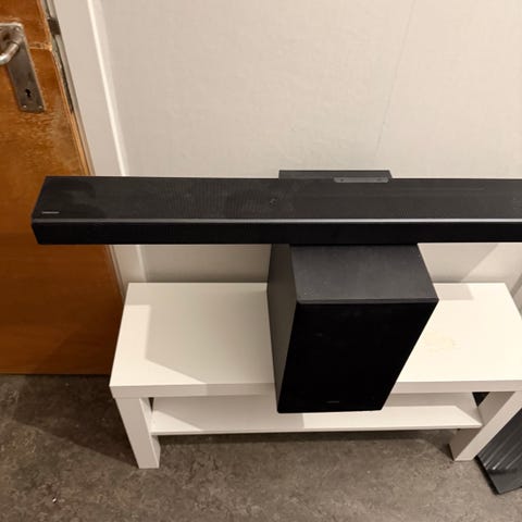 Samsung soundbar med tillhörande subwoofer och fjärrkontroll, välfungerande och i gott skick, inkluderar även väggfäste till TV (One For All) med hylla för soundbar.