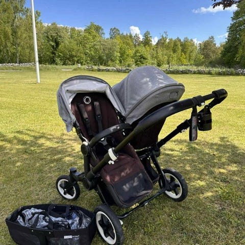 Bugaboo duovagn i svart färg. Vagn med sitt- och liggdel, anpassad för barn. Passar för olika terränger med hjul designade för stabilitet och komfort. Tillverkad i slitstarkt material. 2 regnskydd, sidokorg ingår i priset.